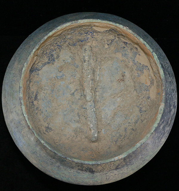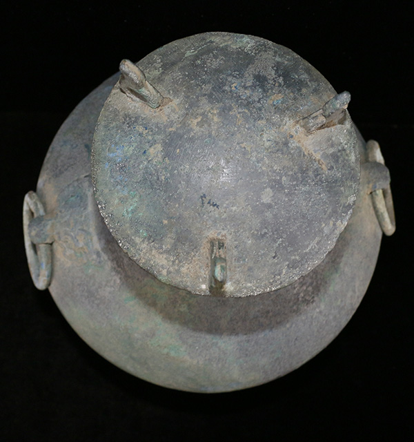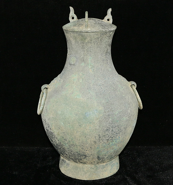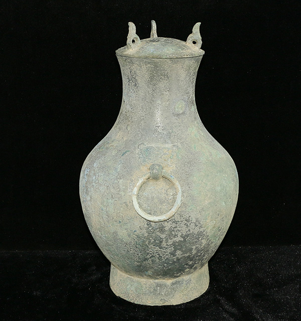 元双兽耳衔环铜壶,侈口,平沿内折,束颈,鼓腹,圈足。颈、身、底分铸。颈部饰以云雷纹为地的六片蕉叶纹,形似蝉体,并附对称的双兽耳衔环,圈足上部以云雷纹为地,上饰蟠虺纹,余素面。