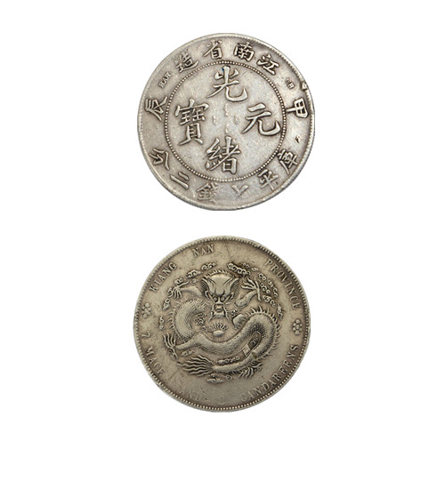 钱币正面中央珠圈内镌满汉文“光绪元宝”四字,圈外上端镌“江南省造”,下端镌币重“库平七钱二分”,左右两侧分镌干支纪年“甲辰”二字,“甲”字上侧镌英文“CH”,“辰”字上侧镌英文“HAH”字样;钱币背面中央镌一个新版龙图,七前无点,上端镌英文“江南省”,下端镌英文“TEN CASH”,左右各镌一个六点花星。其色泽自然,不论是文字还是图案,都显得自然细腻,深浅合适,值得收藏!江南省造甲辰光绪元宝库平七钱二分银币,南京造币厂于光绪三十年(1904年)铸造。