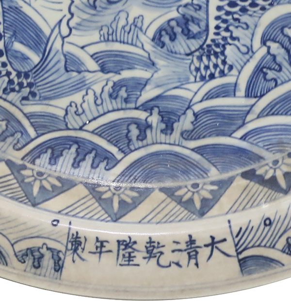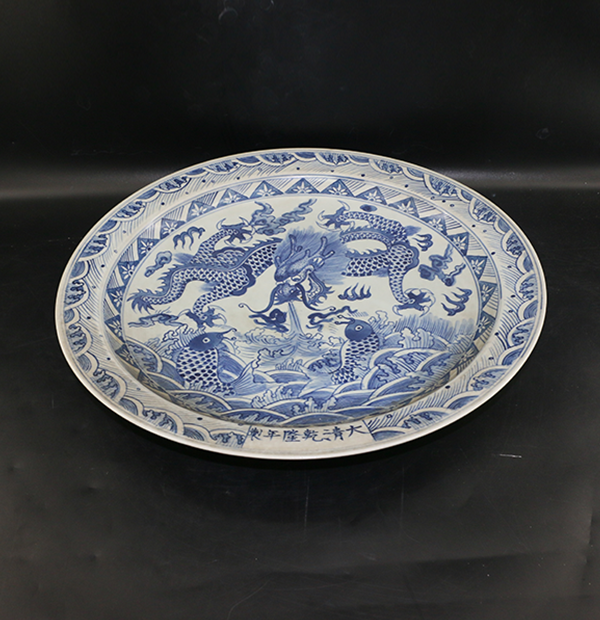 此器胎质细腻光滑,细白砂底,釉白微青,晶莹润厚,菱形花口,板沿,瓣形的盘壁与菱口相对应,内外底心均饰 有两两对称的莲花、菊花、芍药、牡丹等组成的缠枝图案,底心花卉与盘壁的花卉相同。青花纹饰色泽浓艳,浅淡 处结晶斑点较少,浓重处则凝聚成黑色青色,呈现金属锡光,迎光侧视或用手抚摸有凹凸之状,构图严谨,绘画熟 练,是青花瓷中的难得大器。