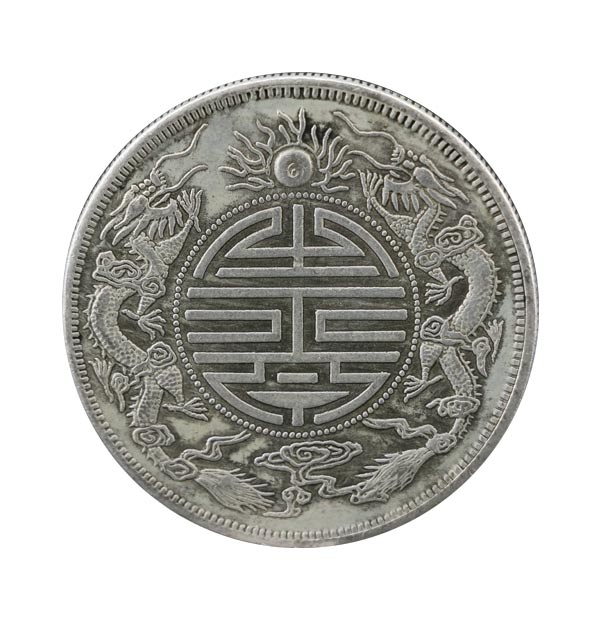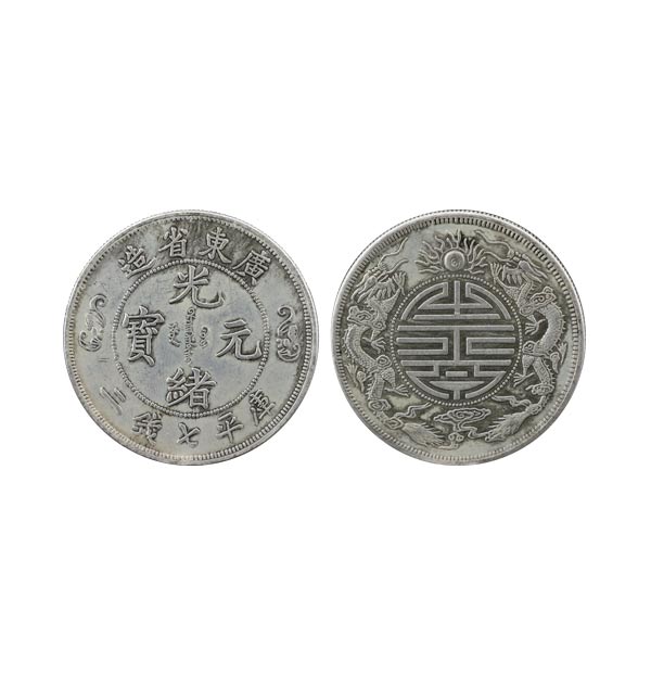 广东省造双龙寿字光绪元宝一枚,此币铸于光绪三十一年(1905)初,为纪念慈禧六十寿辰而铸。张炯伯在《广东省造银币》一文中写道:"惟本品因未纪年,殊难遽断,然观其图案,谐作福寿,环绕双龙,幕无英文,意含颂祝,大异常制。由此以推,成为纪念币之一种,专铸以祝慈禧太后六旬万寿者也。