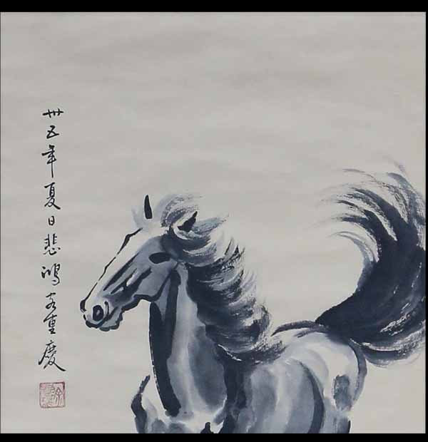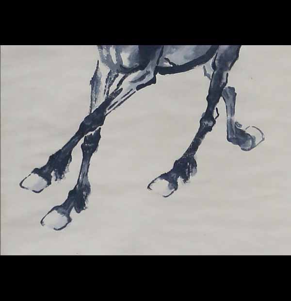 《奔马图》这件作品是画家徐悲鸿在1948年赠给史学家邓蜀生的礼物。徐悲鸿的《奔马图》作于1948年初冬,其时中国人民解放军发起三大战役,傅作义部接受了中国共产党的提议,北平和平解放在即。此幅画中,徐悲鸿运用饱含奔放的墨色勾勒头、颈、胸、腿等大转折部位,并以干笔扫出鬃尾,使浓淡干湿的变化浑然天成。马腿的直线细劲有力,有如钢刀,力透纸背,而腹部、臀部及鬃尾的弧线很有弹性,富于动感。整体上看,画面前大后小,透视感较强,前伸的双腿和马头有很强的冲击力,似乎要冲破画面。