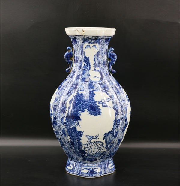 青花松竹梅纹八棱罐,是元代器物。此件器物圆唇、直口,高领,斜直肩,鼓腹至底部略收。器物整体造型宏魄,器型硕大,胎体厚重,略有变形。通体施青白釉,釉层滋润,青花发色青中泛紫,淡雅柔和。底足砂底无釉,修足不够规整。