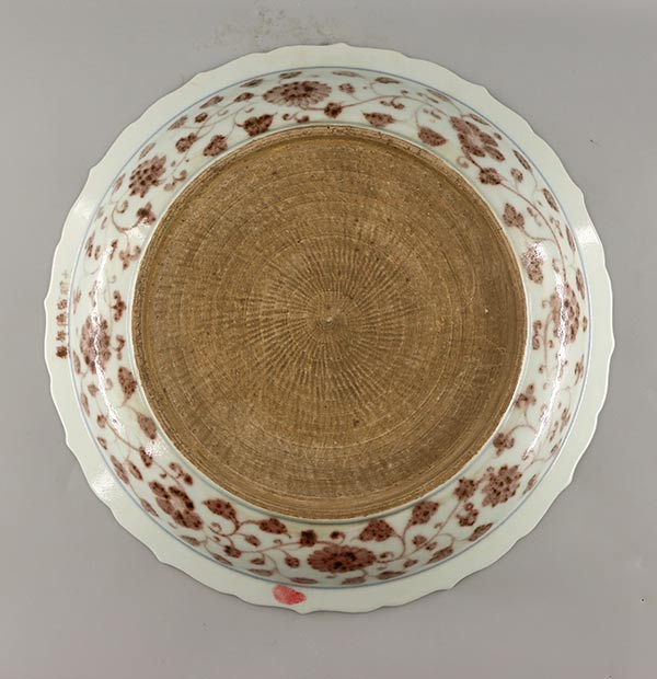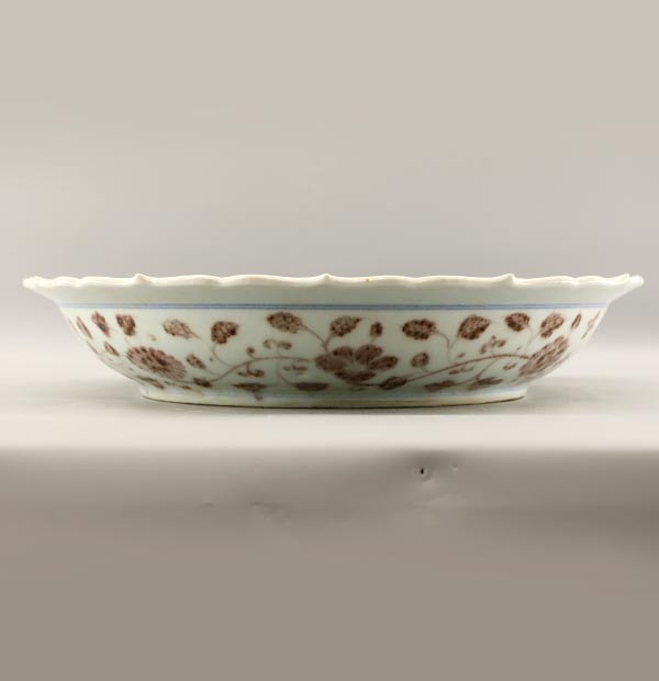 釉里红是我国的传统釉下彩装饰之一,它是用铜作着色剂的色料在坯体上描绘各种纹样,然后施透明釉经过高温还原气氛烧成,在釉里透出红色的纹样,故称"釉里红"。 因烧成合格品很困难,故其产品极为名贵。釉里红有单独装饰的,但大多数与青花相结合在一起进行装饰而称为"青花釉里红"。其特点既有青花的"幽靓雅到致,沉静安定"的特色,又增添了釉里红的浑厚壮丽,丰富了色彩效果,形成了高雅而又朴实的艺术风格。因此,青花釉里红瓷成为我国珍贵的品种之一。