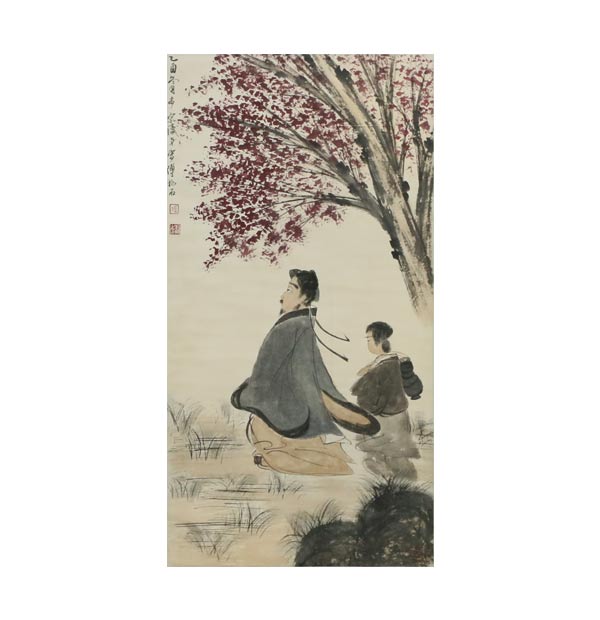 傅抱石(1904~1965),原名长生、瑞麟,号抱石斋主人。生于江西南昌,祖籍江西新余。现代画家。早年留学日本,回国后执教于中央大学。1949年后曾任南京师范学院教授、江苏国画院院长等职。擅画山水,中年创为"抱石皴",笔致放逸,气势豪放,尤擅作泉瀑雨雾之景;晚年多作大幅,气魄雄健,具有强烈的时代感。人物画多作仕女、高士,形象高古。著有《中国古代绘画之研究》《中国绘画变迁史纲》等。1904年10月5日生于江西南昌的一个修伞匠人家,祖籍江西新余。少年家贫,11岁在瓷器店学徒,自学书法、篆刻和绘画。1921年他以第一名免试升入省立第一师范。其时他在治印之余开始读一些古代画史画论,尤其是看到石涛的“我用我法”顿开茅塞,他更欣赏石涛“搜尽奇峰打草稿”的思想。