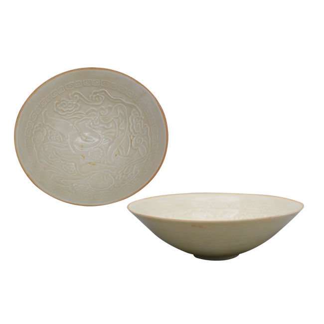 定窑为宋代瓷业代表之一,深得当时及后世之推崇,以精细白瓷著称,其中,刻划花为其重要的装饰手段。由于图案深浅不一,釉色往往也呈现出浓淡层次,有的另加复线,营造出生动立体的艺术效果,尽展名窑风范。 该盘为宋代定窑之佳作,造型简约,胎质细白,所施白釉轻薄透明,微微有聚痕,静穆滋润,呈现出象牙一般的质感,隽永而淡恬。碗沿口有芒,芒口是定窑采用覆烧工艺的结果。内壁所刻花卉为定窑白瓷器中最经典的纹样婴戏纹,线条婉转舒畅,有如春风拂柳,诗意盎然,令观者心旷神怡,此藏品具有极高收藏价值及升值空间。