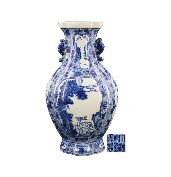 青花开光六合同春双耳棱口瓶
