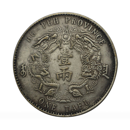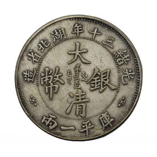 银币正面中央珠圈内镌满汉文"大清银币"四字,珠圈外上环镌汉字"光绪三十年湖北省造",下环镌汉字"库平一两"。银币背面中央镌汉字"壹两",左右环镌双龙戏珠图案,龙图外上环镌英文省名HU-PEN PROVINCE(湖北省),下环镌英文币值ONE TAEL(一两),左右两端镌满文"一两"。银币文字俊秀,龙图生动传神,堪称清代龙洋中的典范。