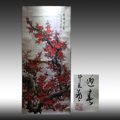 初观此幅红梅图,即为其不凡的气势所震撼。构图别出心裁,一片红梅占据了大部分画面。色墨相映,笔力苍浑,气足墨酣.枝干用浓墨,主干直上直下,用笔凝重浑厚,于拙朴中见秀雅,给人以刚正平直而富变化的感觉.虬枝以篆书法写出,枝柯交插,坚韧如屈铁,呈倔强之势.红梅用没骨法画出,点缀枝头,疏密相间,浓淡有别.红梅形状色泽恰似被击碎的珊瑚。份外妖娆。其画貌似粗疏而内蕴浑厚、俊逸,大气磅礴。以“重、拙、大”的力量感与意趣特色,一扫清末画坛的柔媚轻俏的清艳之风,达到了超越前人炉火纯青的完满园熟之境,令人耳目一新。